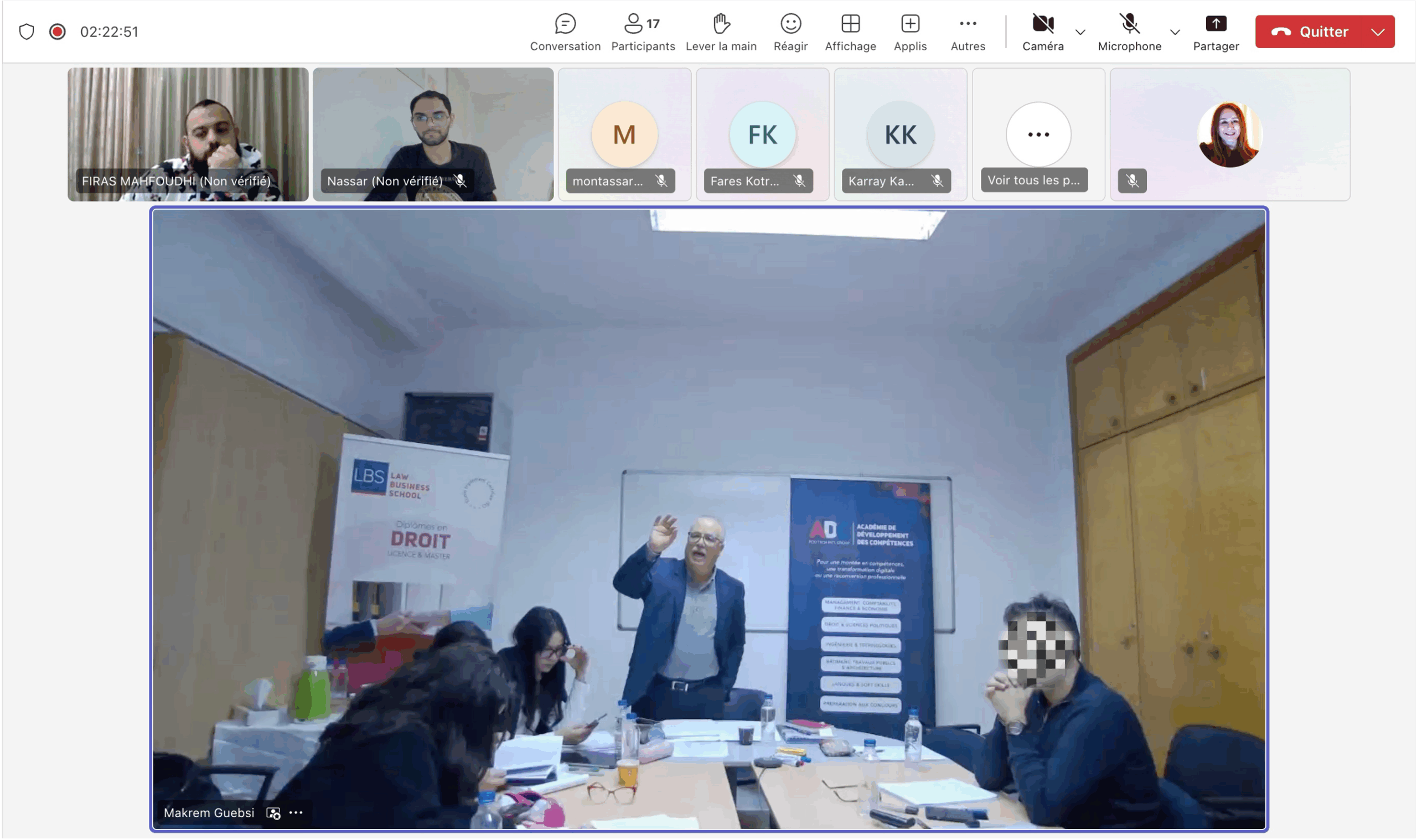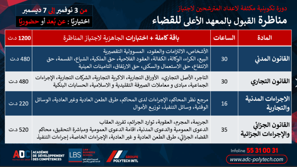 Cette formation, dispensée en langue arabe et accessible en format hybride (présentiel ou en ligne), est conçue à la fois pour les candidats souhaitant préparer le concours d’admission à l’Institut Supérieur de la Magistrature (ISM) et pour les étudiants, jeunes diplômés en droit ou en sciences politiques, ainsi que les professionnels (juristes d’entreprise, avocats, magistrats, conseillers juridiques) désireux de se former ou de renforcer et actualiser leurs compétences juridiques. Dispensée par des magistrats, avocats et professeurs expérimentés, elle couvre les matières fondamentales du droit civil, du droit commercial, de la procédure civile et commerciale, du droit pénal et de la procédure pénale, avec un enseignement appuyé sur les textes législatifs. Le programme propose 111 heures de formation intensive, alliant cours théoriques, applications pratiques et évaluations régulières, avec un accompagnement personnalisé. Une attestation est délivrée à l’issue du parcours.